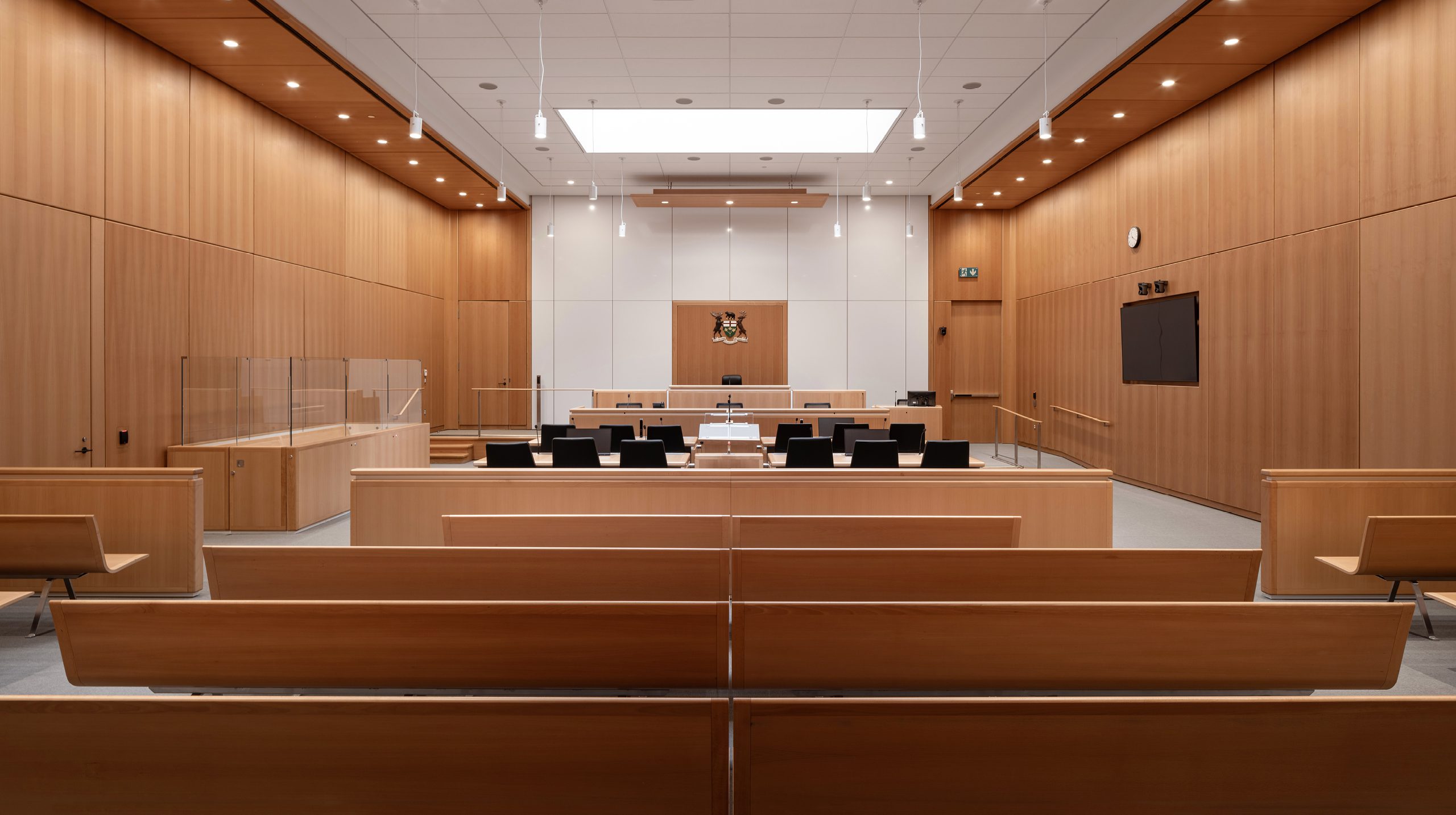 The architecture expresses a clear image with a simple form that is both legible and transparent. The transparency of the lower levels, in particular a 20-meter-tall atrium surrounded by a minimal cable façade, allows for a relationship to exist between the institution and the city. A 90-meter-tall architectural mast marks the judicial precinct and aligns to the East portico of Osgoode Hall, and the northern terminus of York Street. The envelope of the tower is characterized by a layering of embossed metal panels, wood frames and low iron glass generating a materiality that is dynamic and in constant flux and is capped by a significant photovoltaic array.